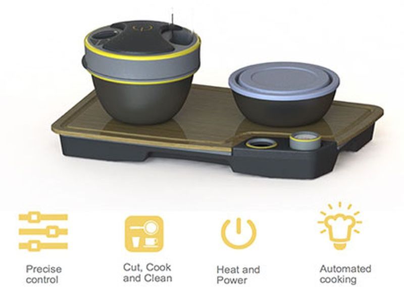 The BEAM micro kitchen includes a BEAMpro, BEAMbase, BEAMbowls, Sous Chef and BEAMlids which increases cooking efficiency and reducing clean-up. This system features electromagnetic coils which power the induction cooktop and blender, without requiring an extra power cord.