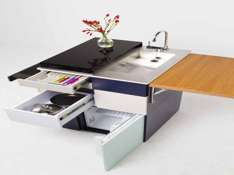 Hailed as “Tube,” the mini kitchen module takes its shape from 2 tubes that are united by a stem. Presenting a double decked glass case, the modular kitchen also features a round cooker (with induction technology) for a burn-free cooking. You may store small dishes in the oval drawers; while on the other hand, a big hatch provides amble space for saucepans. Moreover, the mini kitchen includes a table that comes out the module to dine the food for a small family. Simply smart and space saving, a boon for compact urban apartments!