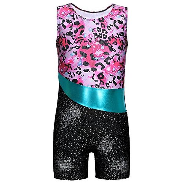 6. DAXIANG Spring Colorful Ribbons Pink Leopard Shiny Gymnastics Leotard for Little Girls