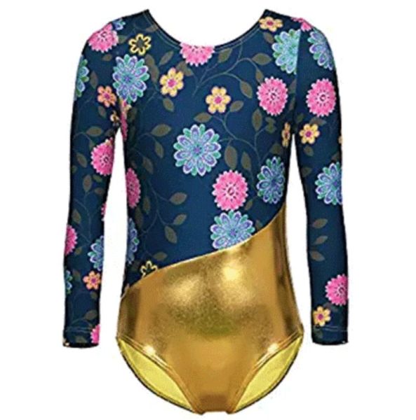 7. Spring Floral Stars Gold Gymnastics Athletic Leotard Long Sleeve for Little Girls
