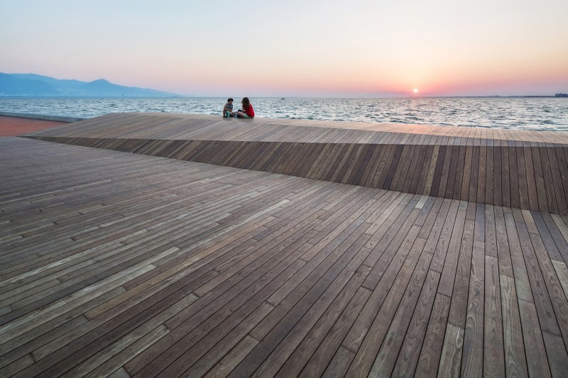 Bostanlı Footbridge and Bostanlı Sunset Lounge is an interactive public place contrived by designed studio Evren Başbuğ Architects. Combining two interventions at one point, this unique architectural design is the part of the ‘Izmirsea’ coastal regeneration project in Turkey. In addition, the new structure features an asymmetrical cross-section that’s made from several thermo-wood surfaces fixed on a solid steel frame. Furthermore, this section becomes a pleasant seating space for the visitors to sit and enjoy the panoramic view of the bay. Hence, it is a novel public leisure point that seamlessly blends with its surroundings and has been designed to reconnect people with the environment.