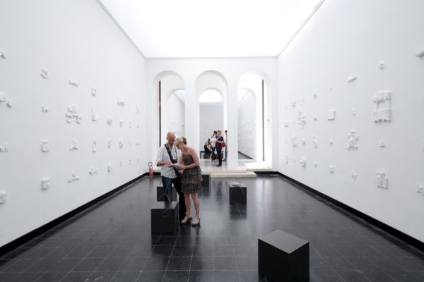 The Austrian Pavilion was all white and dedicated to the most emphatic works of architecture in the world, which are the parliament buildings. It shows the 196 national headquarters, from the ceiling to the floor, all replicated on a small scale with labels.
